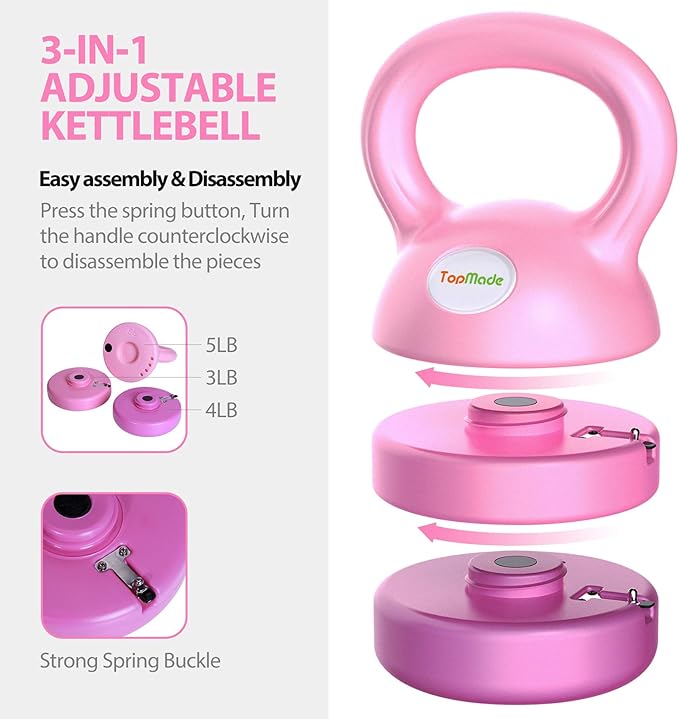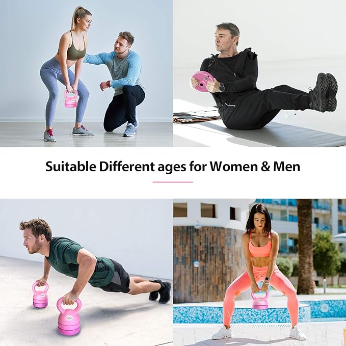 - Adjustable Weight: Easy to assemble, click and twist design makes adjustable kettlebell effortless to adjust from one weight to another; Multiple weight variations: 5lb kettlebell, 8lb kettlebell, 9lb kettlebells and 12lb kettleball