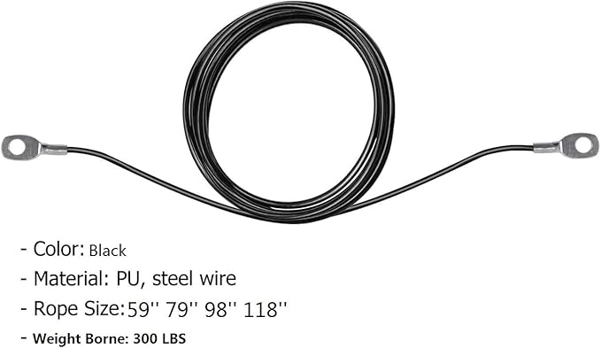 - 1.Cable diameter of 0.2inch/5mm,Length 118'', includes the black nylon coating,Maximum weight capacity is 300 LBS.Optional length, easy to install.