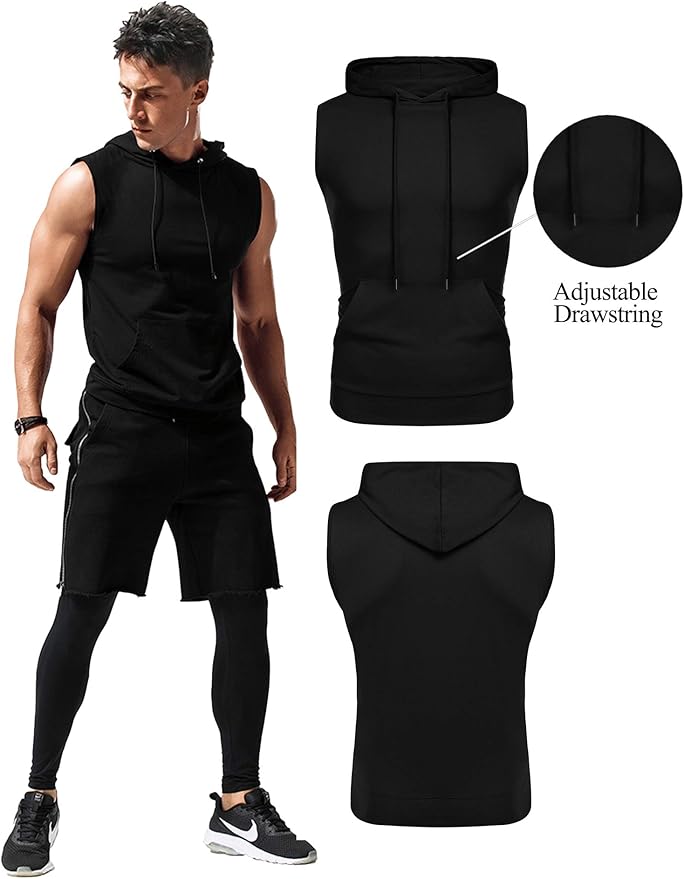 • UNIQUE DESIGN:Mens hooded muscle gym shirt is designed for motion freedom,sleeveless design,solid colors,and a practical kangaroo pocket in front can store your belongs,and the fitted and neat cut off ,The elastic ribbed hem design of the top,allows greater mobility in any direction