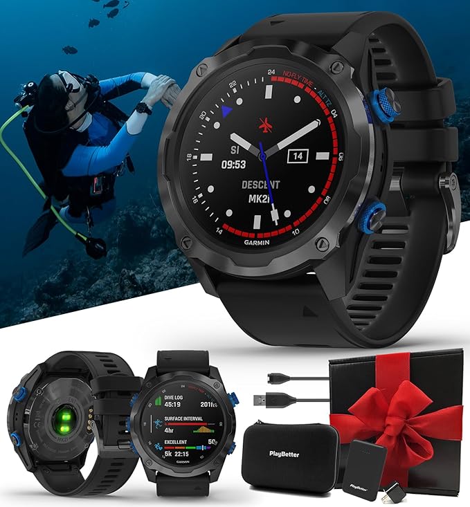 - Garmin Descent Mk2i Gift Box Bundle: Garmin Descent Mk2i Dive Computer Watch, Extra-Long Adjustment Strap, PlayBetter 5000mAh Portable Charger, Wall Charging Adapter & Protective Hard Case | Beautifully Packed in our Black Gift Box with Red Bow & Crinkle Paper