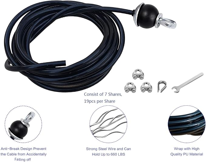- Specification: This wire rope diameter 0.24inch/6mm including the black PU coating. It is more strong than 5mm. Made of high-strength PU materal + steel wire.The steel wire is consists of 7 shares,19 peices per share,