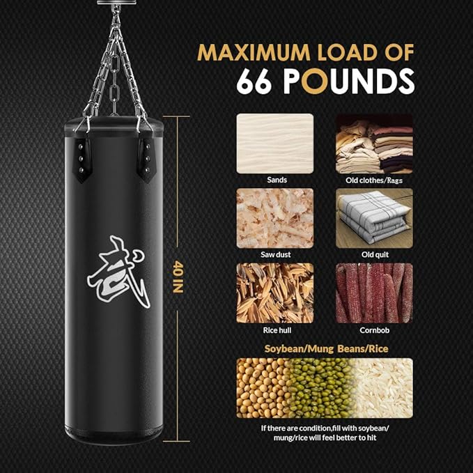 - [ DIY Design Hanging bag ] : Does NOT come with fillings but easy to fill it. You can use some sand, rags, old clothes, old quilts, foam, wood chips, sponges, sawdust, beans and other substances as fillers. Our adult unfilled boxing bag allows you to customize its weight and softness to meet your actual needs to do different training.