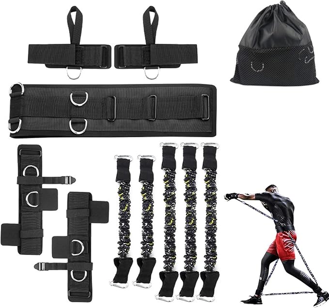 - 【MULTIPLE EFFECT】- Boxing resistance training bands suit can enhance the explosive force of the arms, legs, chest and waist, improving the speed and strength of punching and kicking, and improve your physical skills to a higher level. Great full body resistance trainer for boxing, taekwondo, MMA, fencing, basketball, volleyball, baseball, track and field sports, etc.