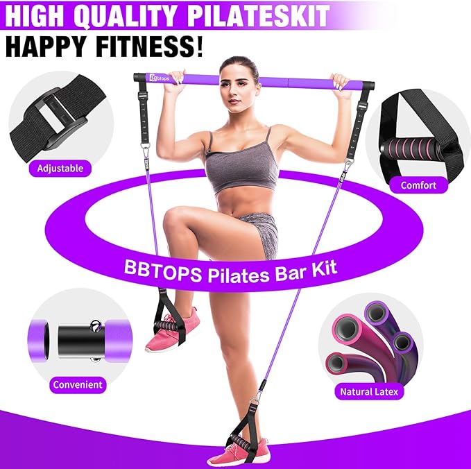 - 【Bbtops Pilates Bar 】- Pilates Bar Kit with Resistance Bands composed of three steel pipes,four resistance bands equipped are made of natural latex, upgraded adjustment buckle and nylon rope with clear graduations. Just press the button easily, you can adjust the nylon rope to the desired length more quickly and accurately when training different movements. It can help you improve your strength, flexibility, and balance. which is strong, durable, and non-slip.