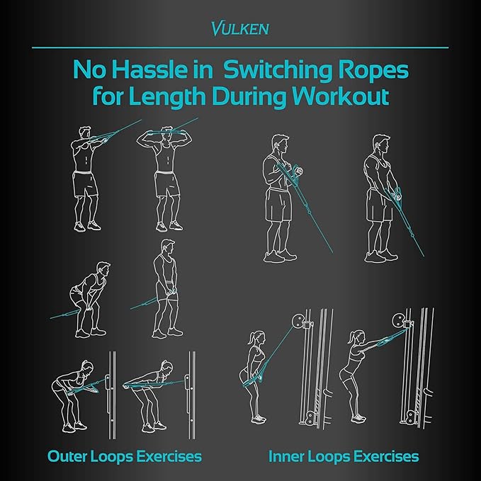 - One Triceps Rope for Diversified Exercises: No need to switch between multiple triceps ropes of different sizes for various exercises anymore. With the Vulken triceps strap, you can handle it all with just one rope. Its two-lengths-in-one design provides great versatility to your workout routine by allowing you to easily switch lengths between different rope exercises such as face pull, triceps pushdowns, bicep curls and more cable attachment exercises.