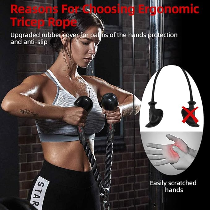 - 【💪Tricep Rope Cable Attachments】35 inch Tricep Rope Suite a variety of exercises to sculpt your triceps, lat, cable push-down, overhead extensions, etc. A useful gym attachment to grow your wide shoulder. It's not only great for the professional but also helpful for beginners.