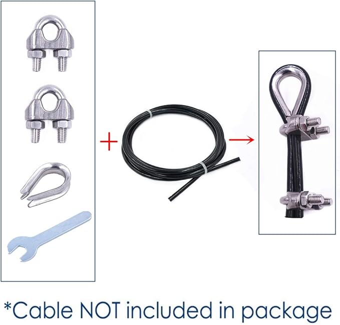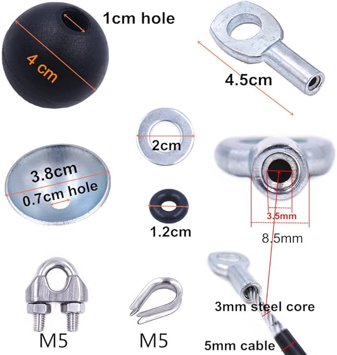 - DURABLE MATERIAL: The ball is made of high quality plastic, the bowl-shape plate is made of metal alloy. The eyelet terminal is made of metal alloy. The wire rope clamp and thimble are made of 304 stainless steel.