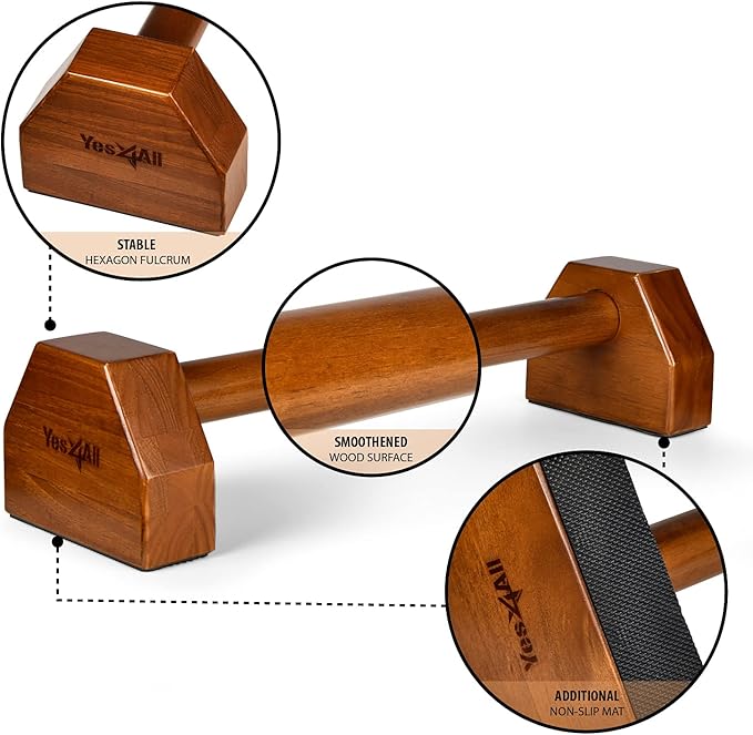 - SOLID CONSTRUCTION: Yes4All wooden parallettes are designed with longer handles, stable hexagon fulcrum and firm joints that bring users sturdy construction for peace-of-mind workout.