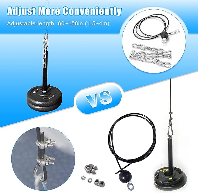 - 💪【2 Steel Wire Ropes】 1.5m cable + 1.8m cable, used together with the iron chain presented, the use range can reach 1.5 to 4 meters, fully meeting different fitness needs.