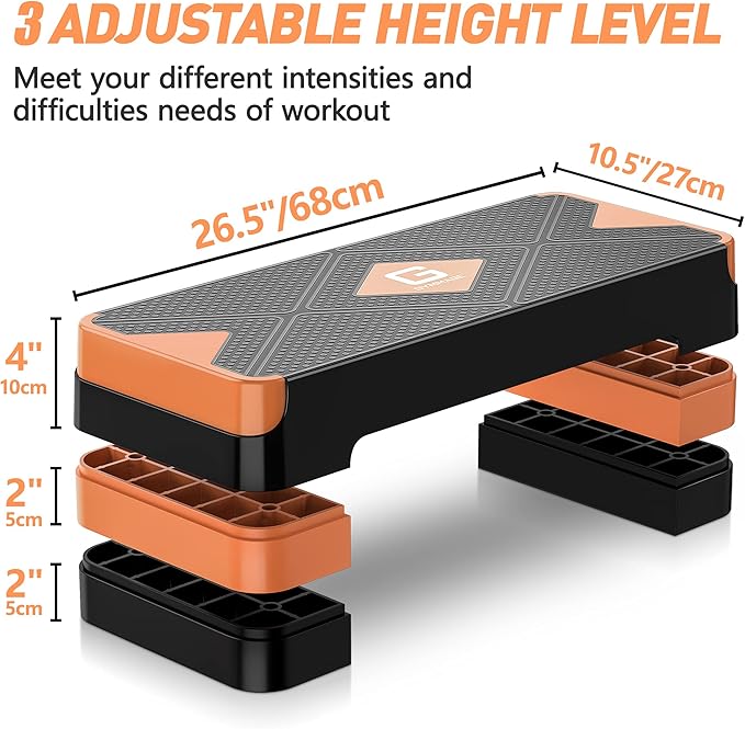 - UPGRADED 3 EASY ADJUSTABLE HIGHT: GYMMAGE Aerobic Stepper comes with 26.5" x 10.5" wide platform and 4 risers (2 pairs of risers). Intensify workout difficulty by adjusting platform height from 4” to 6” to 8” using risers to challenge yourself. Perfect for any levels of user of all ages.
