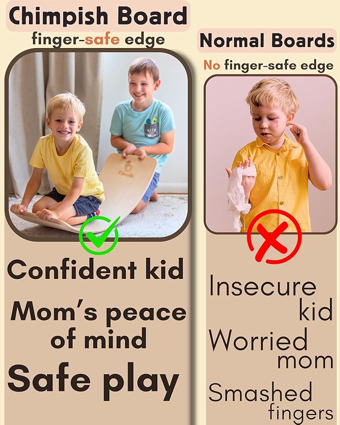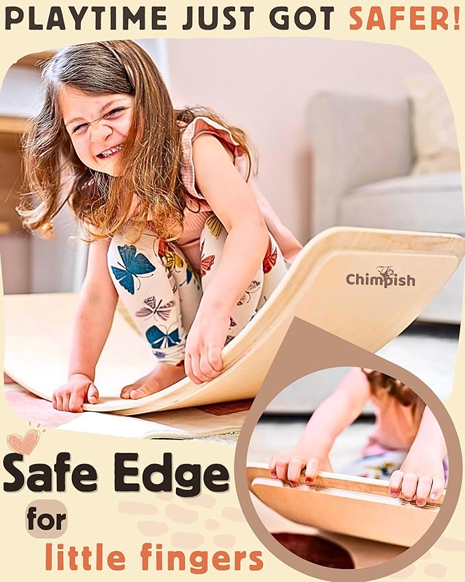 - π€ πͺππππ π’π§πππ₯ ππ’ππ₯ππ¦ ππ₯π¨π¦π πππ‘πππ₯π¦, when placed under the board; CHIMPISH wooden wobble balance board is designed with kids safety in mind. Featuring a safe space for your little one fingers on all the sides. So you don't have to watch kiddos while they pretend surfing or swing around. Your CHILD WILL LOVE HIS INDEPENDENCE & YOU'LL HAVE PEACE OF MIND, FINALLY!