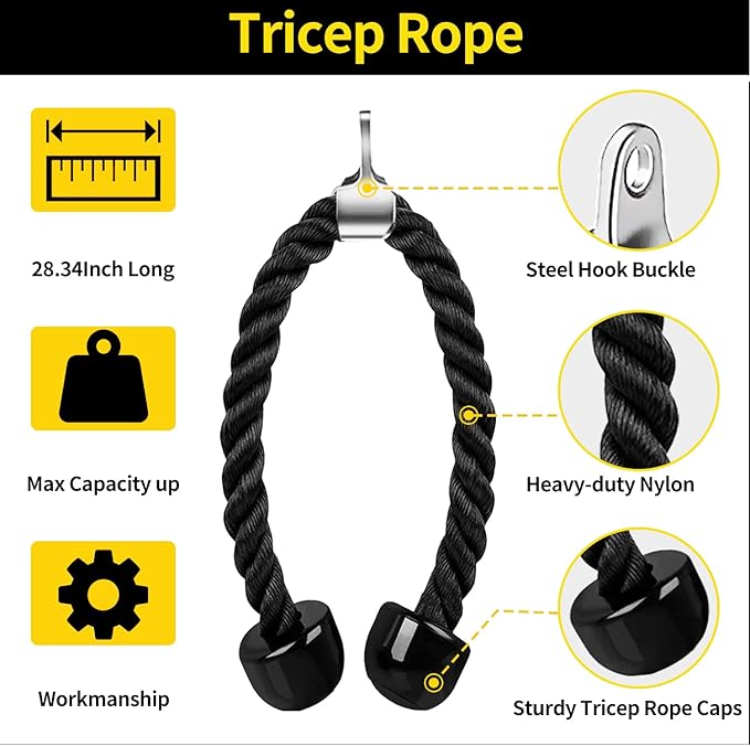 - 【27” TRICEPS ROPE】 - Made of strong nylon-braided rope and equipped with large plastic blocks at the end of the rope to enhance performance & prevent slipping or sliding while practicing. Longer 27INCH rope and weight capacity 500LBS perfect for pull-downs, triceps press-downs, upright rows, straight bar curls, and more.