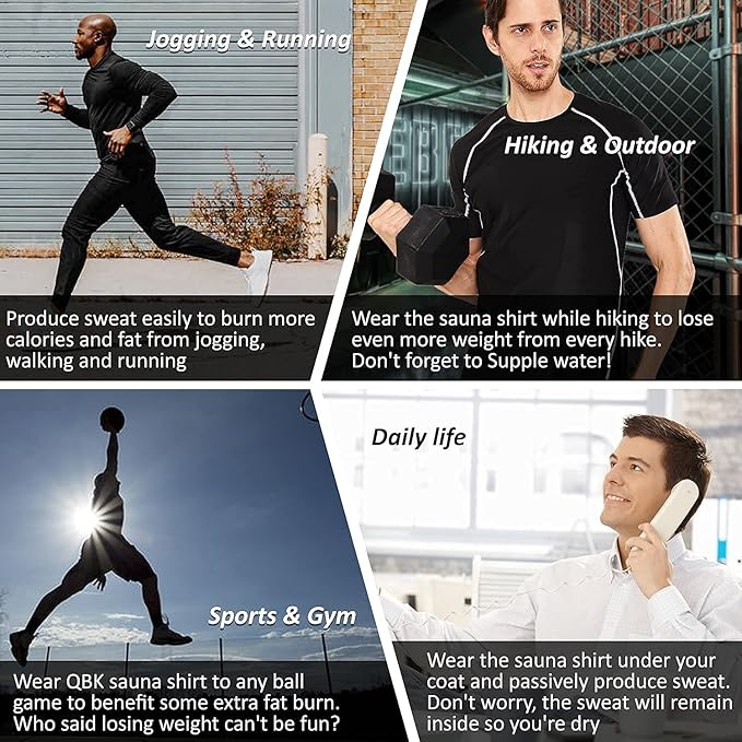 - SWEAT MORE:QBK's sauna suit was designed to increase sweat.This sauna shirt is made of top quality heat trapping polymer fabric to promote blood flow and increase body temperature.Style with T-shirt cut to maximize the compression area and offer higher compression.Increase sweating through sports,produce 3 times more sweat.This sweat suits for men makes you sweat in the right body parts.Keep internal temperature and produce more sweat.