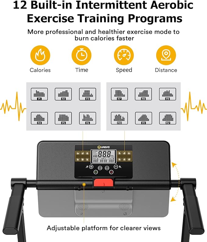 - Most Effective Running Modes of Reducing Fat: HIIT is internationally recognized as the most effective method of reducing fat. To burn calories more effectively, we specially programmed 12 different HIIT running setting, with the help of these preset training plans, you can choose the best plan to suits your need. Also, the adjustable LCD platform will keep track of your exercise data, such as speed, time, distance and calories.