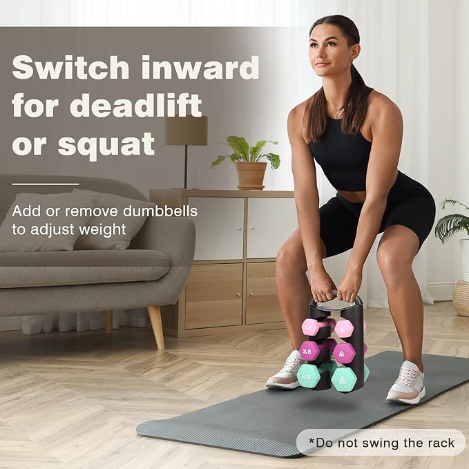 - Creative Portable Multifunctional Dumbbell Rack: No assembly needed. Innovative design for easily switch between A-frame and H-frame by rotating the rack frames. Maximize your space in H-shape and take out dumbbells easily in A-shape. You can also do kettlebell workouts with all the dumbbells on it in H-shape. Ergonomic handle for easy carrying the whole set anywhere.