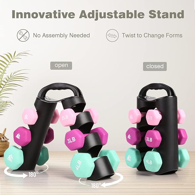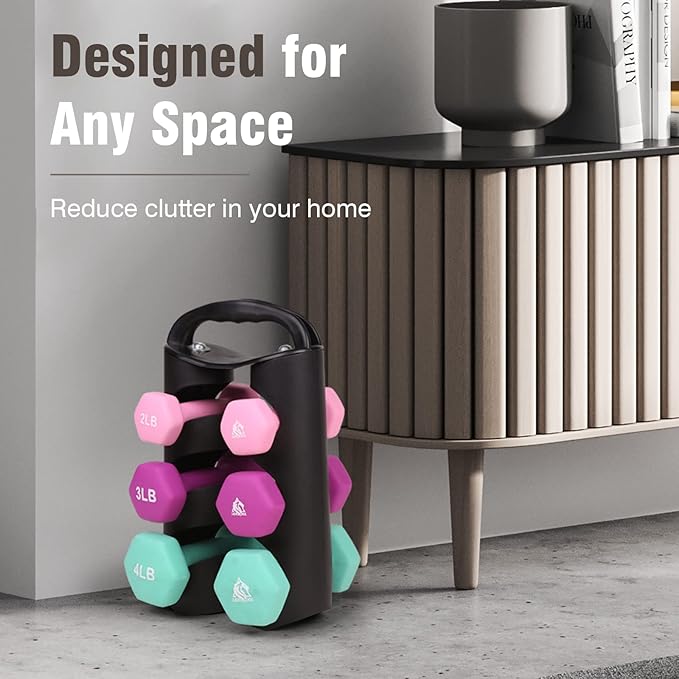 - Graceful Present for Your Friends / Family: Set includes pairs of 2lb, 3lb, 4lb neoprene coated hex dumbbells with a unique dumbbell rack for storage, which is perfect for daily workout targeting specific muscles. Light bright color and soft touching feel will please everyone. It also comes with a poster to help plan your workout.