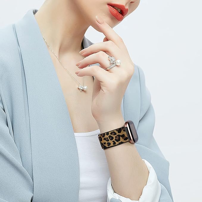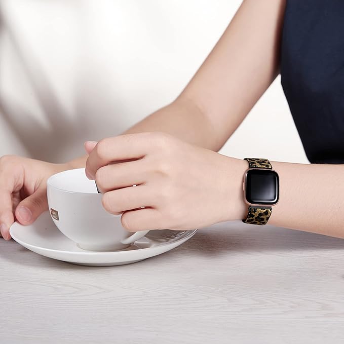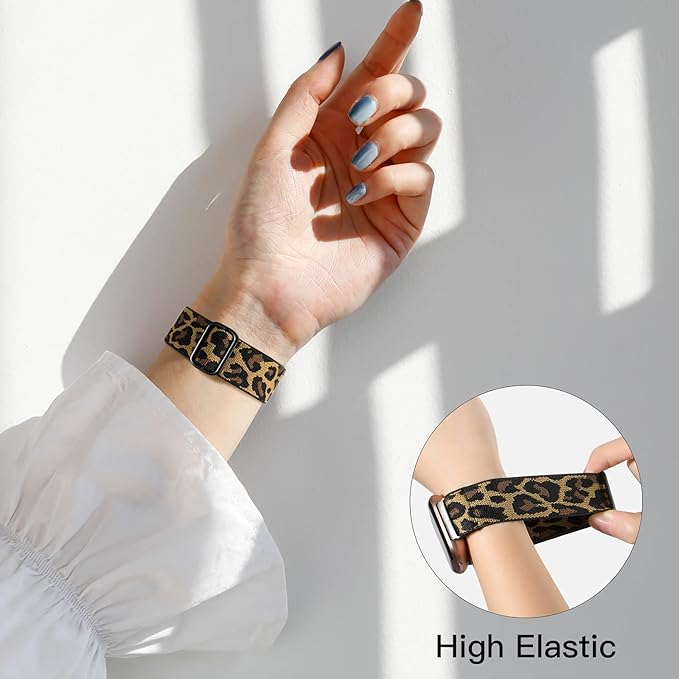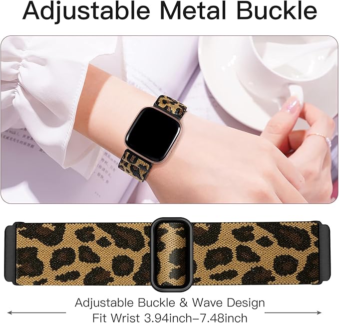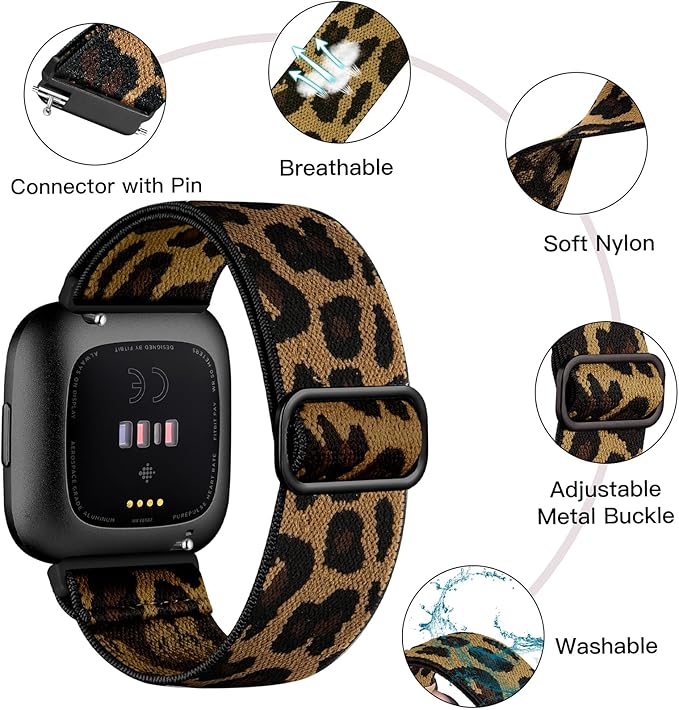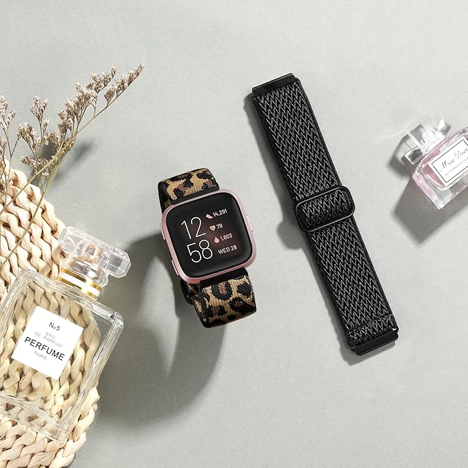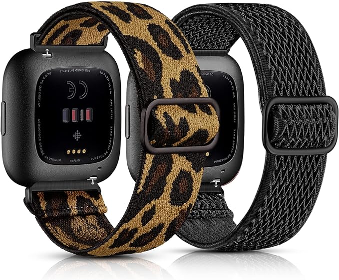 2 Pack Elastic Bands Compatible with Fitbit Versa 2 & Versa Lite Bands for Women & Men, Adjustable Sport Stretchy Nylon Solo Loop Strap Wristbands, Black & Leopard