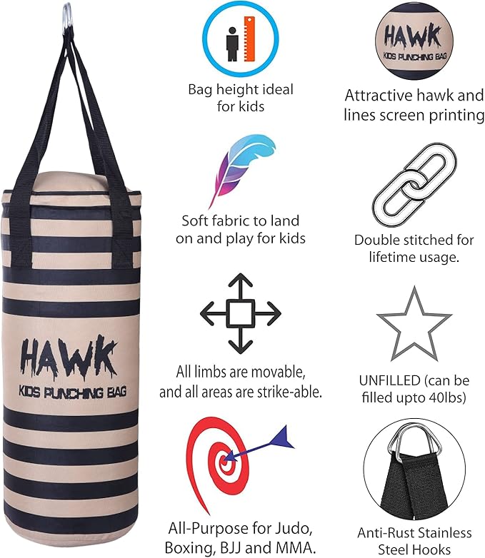 - ✅UNFILLED: The hawk kids punching bag comes UNFILLED and can be filled upto 30lbs with any of the following materials: Old clothes, towels, blankets, raw cotton, poly-fil or any other cotton filler material easily available from any of local store or amazon. NOTE: COMES UNFILLED!