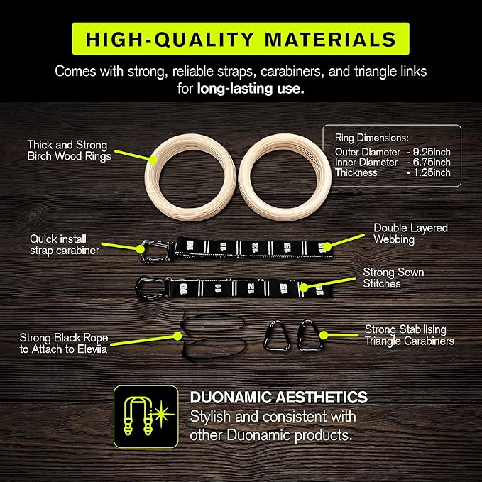 - SUPER EASY SET UP: Takes less than 1 minute to set up the Duonamic Rings with the Duonamic Eleviia Portable Pull Up Bar.