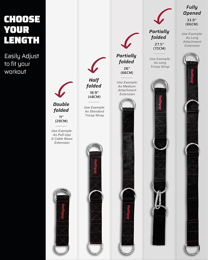 - CUSTOMIZABLE LENGTH FOR EVERY EXERCISE: Each strap offers 5 adjustable lengths ranging from 11" to 33.8" (excluding snap hooks), letting you tailor your setup for maximum versatility and precise motion. Achieve a perfect fit for every workout, whether at home or in the gym