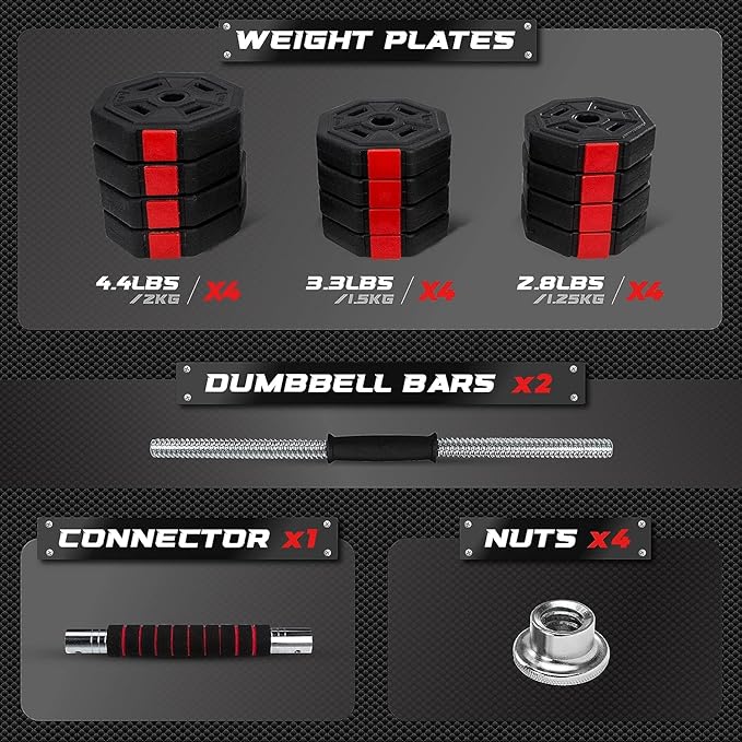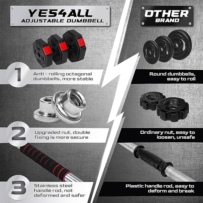 - EASY USE & COMFORTABLE GRIP: Effortlessly assemble and switch between weights, thanks to an ergonomic design that comes with safety features to prevent plates from falling off. Non-slip rubber-coated handle and foam-covered connecting rod is to protect your palms from blistering and easy-to-control dumbbells.