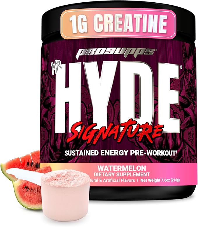 - Crush Every Workout with HYDE: ProSupps Mr. HYDE Signature is a pre-workout powder designed to enhance energy, focus and promote increased blood circulation for peak muscle performance. Developed with trusted ingredients to help anyone from all fitness levels. Watermelon Flavor. 30 servings. 196 mg caffeine/serving.