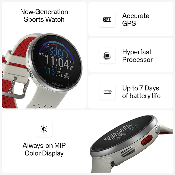 POLAR Pacer Pro Advanced Ultra-Light GPS Fitness Tracker Smartwatch for Runners with Training Program & Recovery Tools; S-L, for Men or Women, White-Red