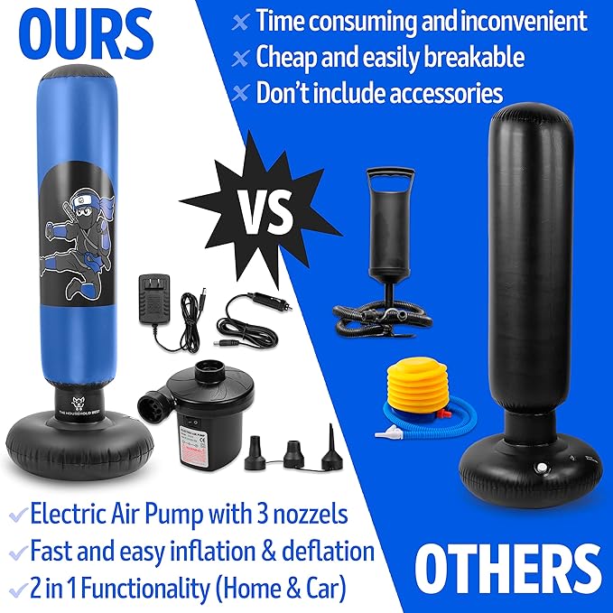 - Effortless Setup & Storage: The punching bag with stand is easy to inflate and deflate using the included electric air pump with 2-in-1 functionality for home and car use. Deflate and store it away in minutes, making it perfect for any home with limited space or for taking along on family trips