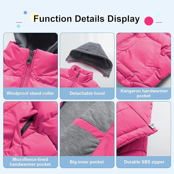 - 💕Practical & Convenient: Insulated Puffy Vest.This girl's or boy's ski vest features zip-front closure(Smooth and strong SBS zipper)Detachable hat with smooth zipper.Reinforced stitching.Wear-resistant fabric.Kangaroo pocket( fleece lining)and 1 inner pocket.Comfortable and soft elastic knit lining.The cutting and materials are nice.It is perfectly puffy, soft, and comfortable