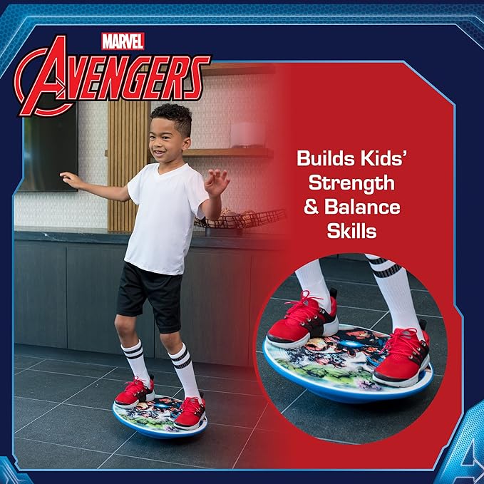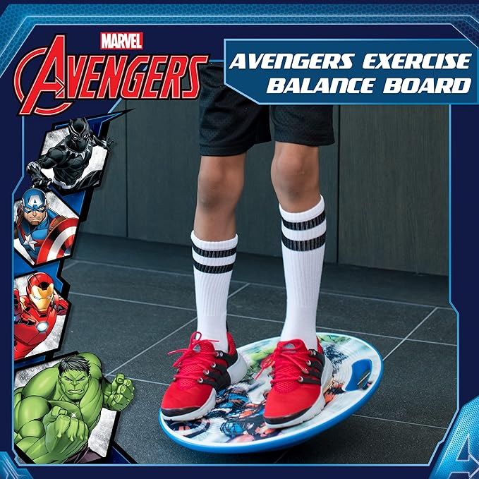 - BALANCE TRAINER BOARD: Fitness balance board decorated with Iron Man, Captain America, Black Widow, Incredible Hulk, Black Panther, and Ant-Man imagery; can be used for both standing and ground exercises, is designed for creative movement and free play, and is ideal for reflex, strength, balance and coordination training for children