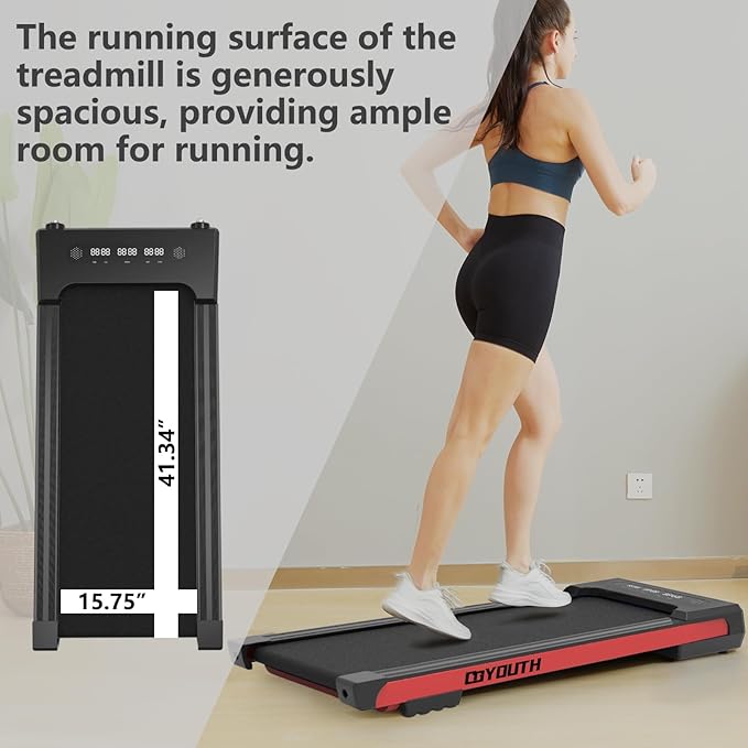 - 【NON-SLIP RUNNING BELT & SHOCK REDUCTION SYSTEM】This walking pad with 15.75" x 41.34" large-area shock-absorbing and non-slip rubber running belt that using this walking machine in an apartment will not disturb other residents. The treadmill is not only suitable for running, but also very under the table for office use. Maximum weight: 300lbs.