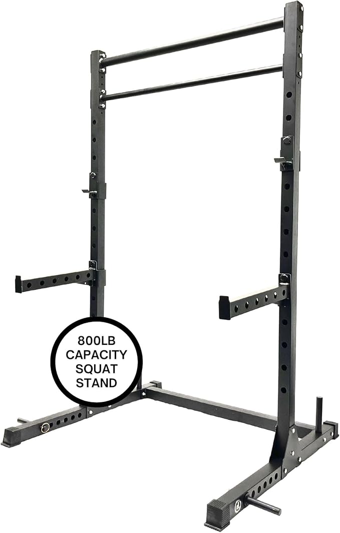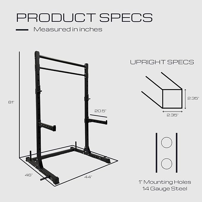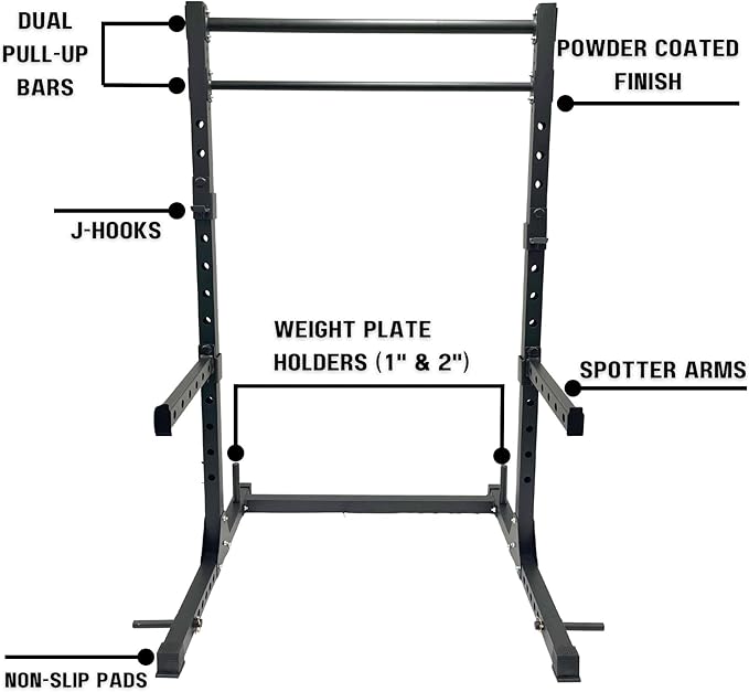 - Home gym exercise equipment targets multiple muscle groups: This versatile, multi-functional power cage offers 2 pull up bars, j hooks, spotter arms, resistance band pegs, weight plate holders, and various gym attachments (sold separately). The squat rack is a one-stop shop that allows you to perform full-body workouts that target your “Core 4”, with exercise examples included: arms (bench press), legs (squats), back (rows), and core (knee raises).