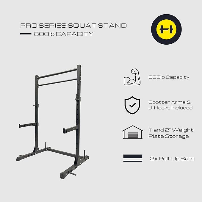 - Squat rack for home gym package includes: (1) Pro Series Power Cage/Squat Rack, (2) Pull Up Bars, (2) J-Hooks, (2) Spotter Arms, (2) 1-Inch & 2-Inch Weight Plate Holders, (6) Resistance Band Pegs. Hardware and instructions are included.