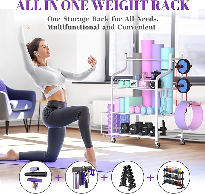 Mythinglogic Yoga Mat Storage Racks,Home Gym Storage Rack for Dumbbells Kettlebells Foam Roller, Yoga Strap and Resistance Bands, Workout Equipment Storage Organizer With Hooks and Wheels