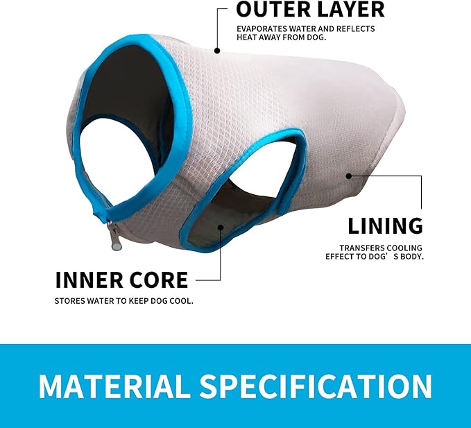 - HOW IT WORKS - Outer Layer:Evaporates water and reflects heat away from dog.Inner Core:Stores water to keep dog cool.Lining:Transfers cooling effect to dog’s body.