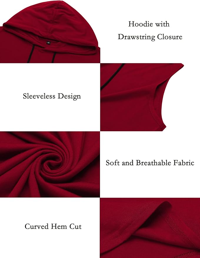 • Unique Design --- This men’s gym hooded tank top with sleeveless design, adjustable drawstring hood, solid colors, and the Loose & curved hem allows greater mobility in any direction.