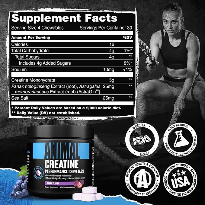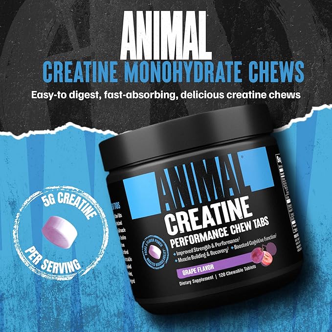 Animal Creatine Chews Tablets - Enhanced Creatine Monohydrate with AstraGin to Improve Absorption, Sea Salt for Added Pumps, Delicious and Convenient Chewable Tablets - Grape