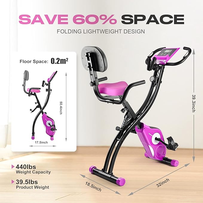 - ✔【Foldable X-Bike Design:】The unique home type compact design of this folding fitness cycling exercise bike can be easily folded to half of the assembled size which does not take up indoor space. With thickened steel tubes and durable accessories, the stable triangle structure can support trainers weighing up to 442 LBS, X-shape design is based on physical balance theory, which make you feel the bike sturdy and don’t worry about falling.