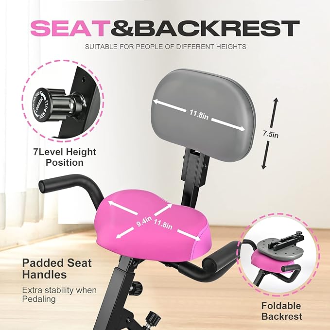 - ✔【Adjustable Seat and Backrest:】Adjustable cushioned seat and backrest provides a comfortable ride with optimal sitting position. We use large soft and comfortable seat cushion (11.8”×9.4”×2.8”) to provide you with the most stable support. The stationary fitness bike seat can with stand up to 265 lbs. Perfect workout bike for home, apartment or office use and recommended for men, women and seniors. Perfect for starting a fitness journey.