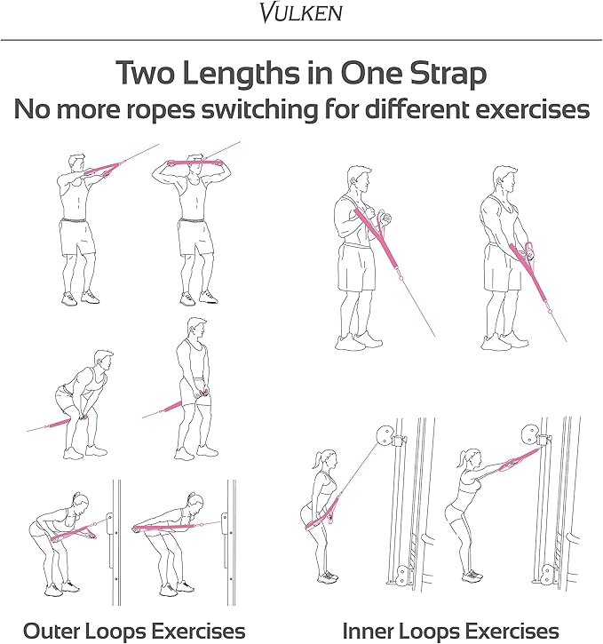 - One Triceps Rope for Diversified Exercises: No need to switch between multiple triceps ropes of different sizes for various exercises anymore. With the Vulken triceps strap, you can handle it all with just one rope. Its two-lengths-in-one design provides great versatility to your workout routine by allowing you to easily switch lengths between different rope exercises such as face pulls, triceps pushdowns, bicep curls, and more cable attachment exercises.