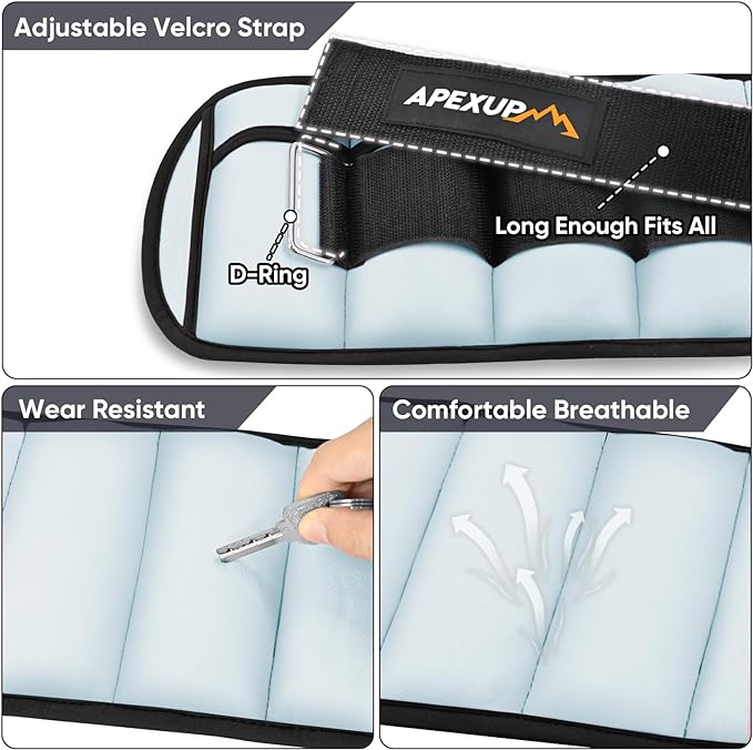 - [PREMIUM QUALITY] APEXUP adjustable ankle strength training weights are filled with iron sand to ensure a compact profile. The sleeve material of the ankle weights for men is soft and breathable, which will give you maximum comfort during workout.