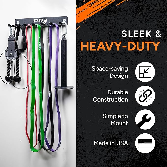 PRx Performance Wall-Mounted Gym Rack Organizer – Heavy-Duty Fitness Equipment Storage for Resistance Bands, Jump Ropes & Lifting Belts– Space-Saving 7 Hook Shelf, Made in USA – Compact Design - Black
