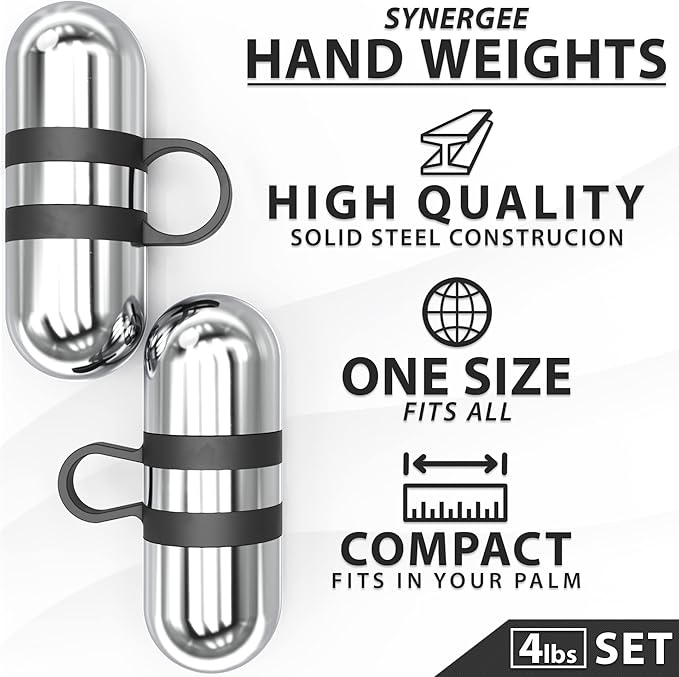 - ★ WHAT’S IN THE PACKAGE ★ – The 4 lb Set of Synergee Hand Weights comes as (2) x 2 lb hand weights. Each hand weight is 3 inches long and 1.6 inches in diameter. This set totals 4 lbs. Each hand weight comes with a finger loop to enhance your grip during workouts, which can be adjusted to a Large or Small setting.