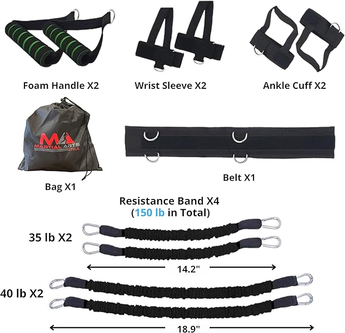 - WHAT YOU WILL GET - 2 foam handles, 2 wrist sleeves, 2 ankle cuffs, 1 adjustable belt, 1 carry bag, 2 resistance bands of 35 lb (14.17 inches) and 2 resistance bands of 40 lb (18.89 inches).