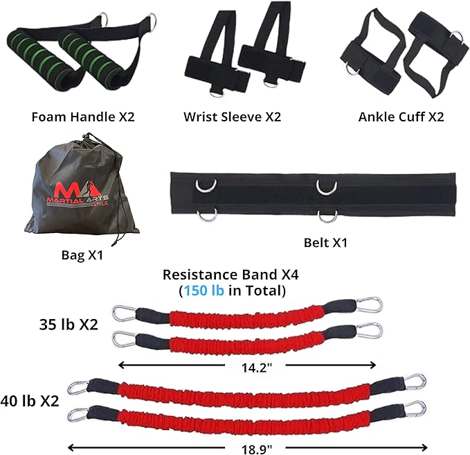 - WHAT YOU WILL GET - 2 foam handles, 2 wrist sleeves, 2 ankle cuffs, 1 adjustable belt, 1 carry bag, 2 resistance bands of 35 lb (14.17 inches) and 2 resistance bands of 40 lb (18.89 inches).