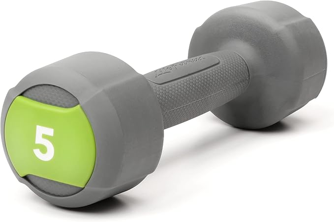 - The construction of each dumbbell features a 5IN long contoured ergonomic handle with an embossed gripping pattern and 1.25IN diameter for comfort.