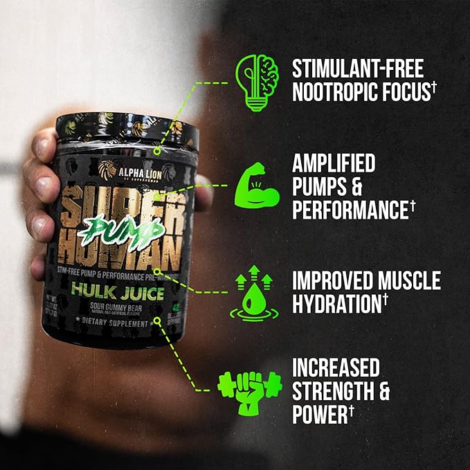 ALPHA LION Superhuman Pump Pre Workout Powder, Nootropic Caffeine & Stim Free Preworkout Supplement, Nitric Oxide Booster, Muscle Gainer, Energy & Focus (42 Servings, Hulk Juice Flavor)