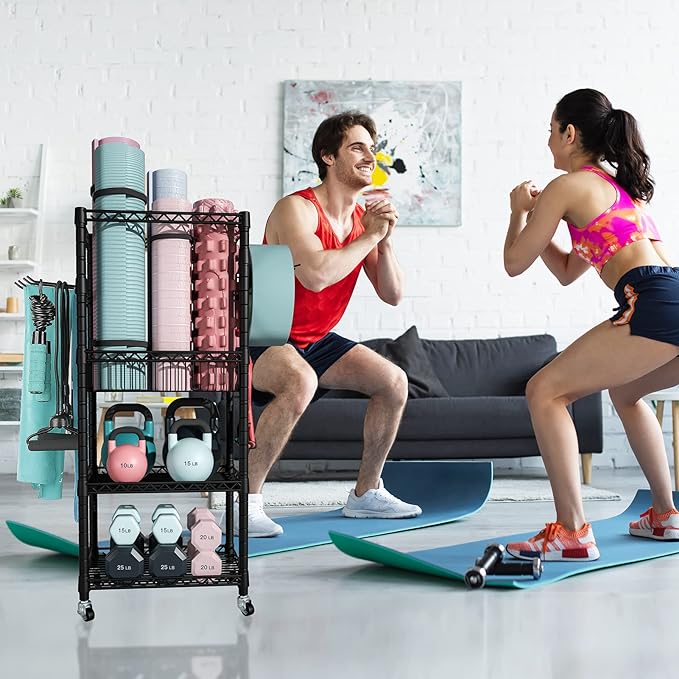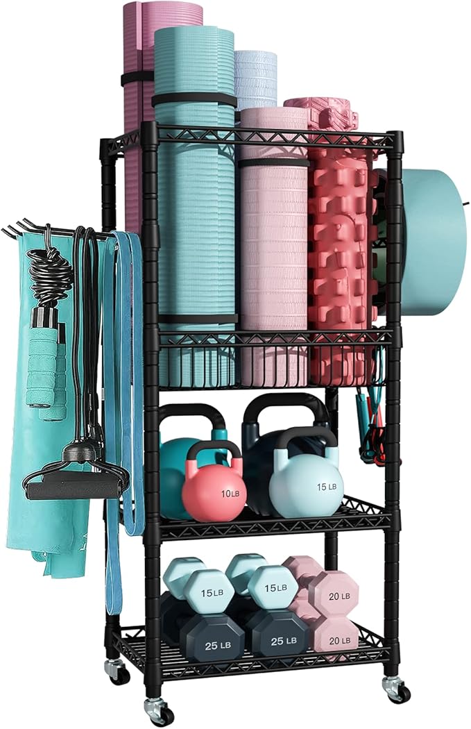 Home Gym Storage, 3 Tiers Workout Equipment Organizer with Wheels for Yoga Mats, Foam Roller, Dumbbells, Kettlebells, and Resistance Bands