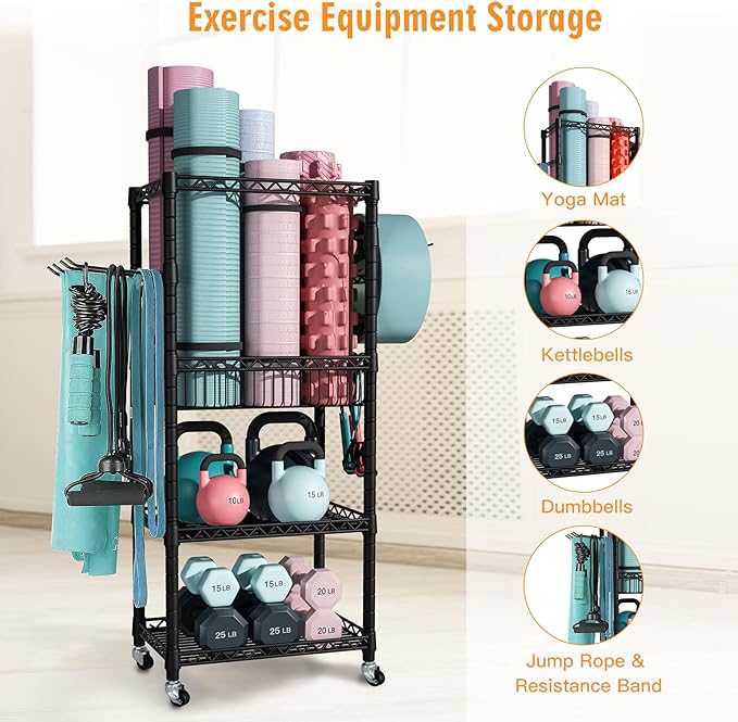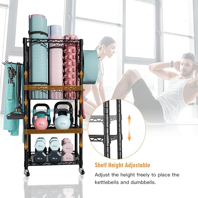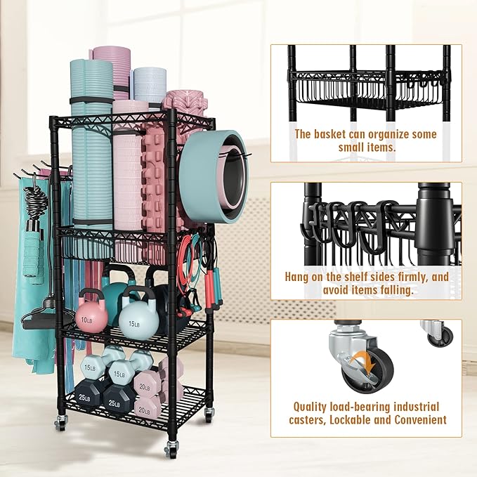 - [Multifunctinal]: The exercise equipment storage is perfect for organizing the workout equipment at home gym, yoga studios, and garage. It allows you to organize exercise mats, yoga mats, foam rollers, yoga blocks, etc