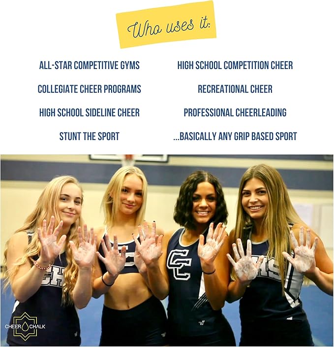 - MAXIMUM GRIP STRENGTH ~ Grip strength is essential in cheerleading, weightlifting, rock climbing, gymnastics, and other athletic activities. Cheer Chalk increases friction and instantly absorbs sweat moisture, leaving your hands feeling grippy and completely dry. A stable grip helps to increase safety for athletes both on the ground and in the air.